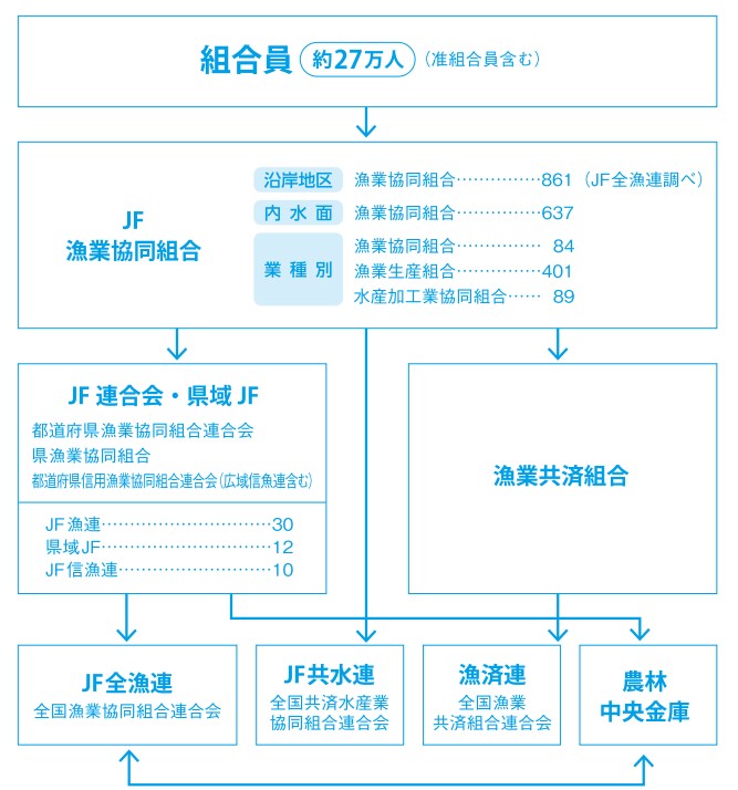 「JFグループ」は、漁業者がつくるJF(漁業協同組合)を基盤とし、都道府県のJF連合会、JF全漁連等でできたJFのネットワークです。